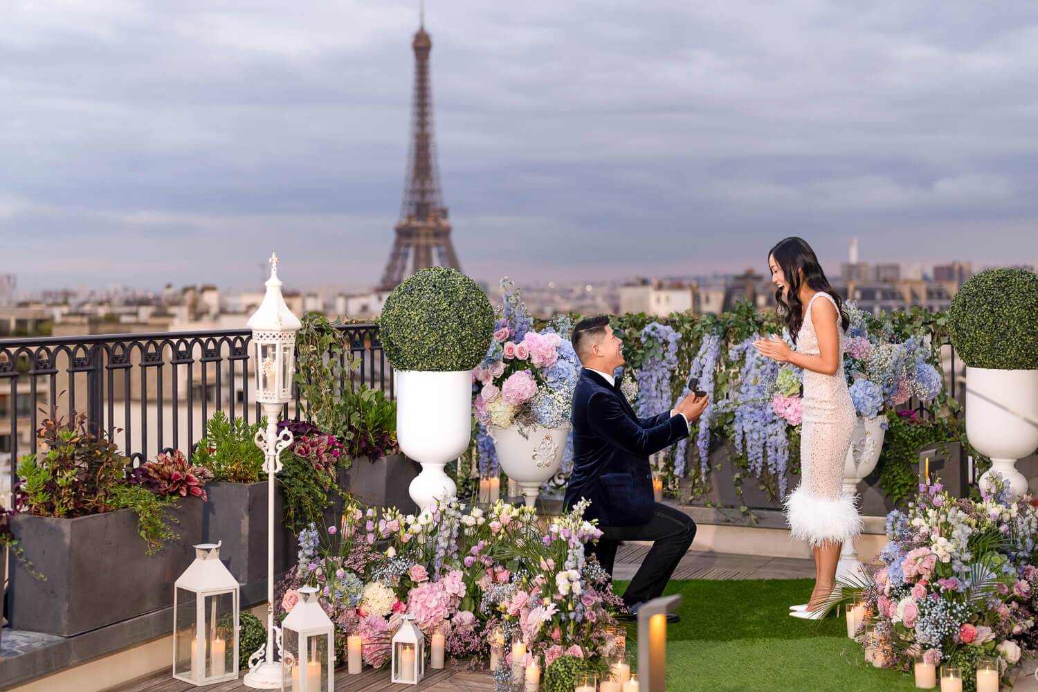 Kiss Me partnered my proposal session with Juliana Aguiar and I could not have asked for a better photographer! She suggested a beautiful plan that included stopping at multiple locations along the way. She was understanding of the pauses needed for impromptu photo ops, as well as breaks needed to cool down from the Paris heatwave we experienced. Throughout the stroll to our final location, she made sure to check in on us and also had lovely casual conversation with my partner and me (which helped to ease my pre-proposal nerves). I would highly recommend her to anyone wanting to have a photography experience that is so calming, engaging, and comforting. An all around amazing experience, Juliana helped to make this once in a lifetime experience that much more outstanding! The setup was jaw dropping, the photos were equally magnificent.